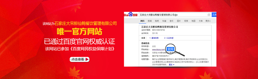 石家莊大宋醉仙鴨餐飲管理有限公司是以大宋醉仙鴨為主導,集武漢精武鴨脖系列,大宋千年燒雞系列,炸雞烤雞系列,熏肉系列等十幾種熟食為一體的品牌管理公司。 大宋醉仙鴨,在宋代祖?zhèn)髋浞降幕A上結合現(xiàn)代的口味,集多家熟食經典潛心研究多年,1998年開了第一家“大宋醉仙鴨”專營店,口味馬上得到消費者認可,信賴。在以后的發(fā)展中在逐步得到全國消費者的驗證。
